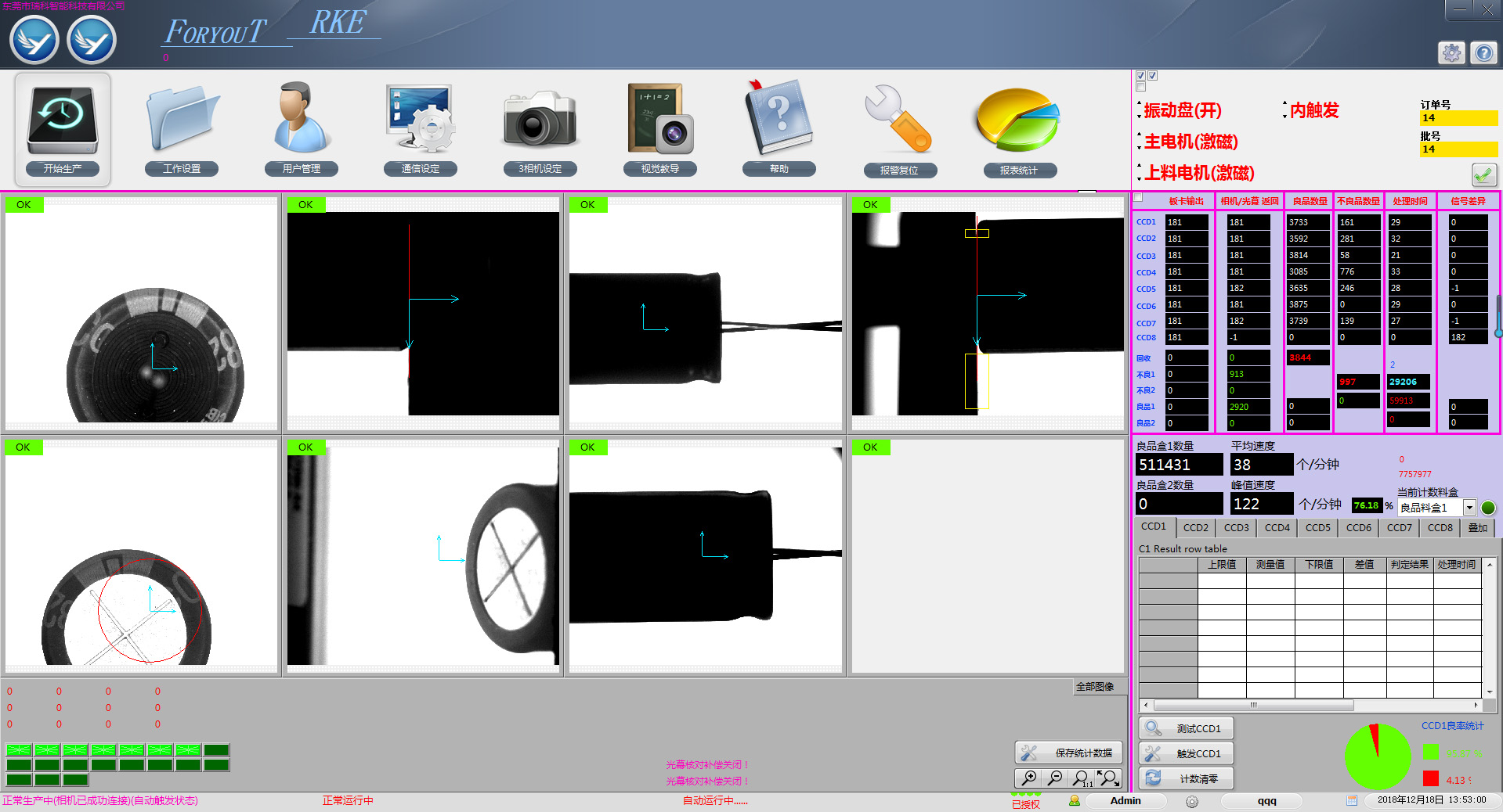 待檢產品到達流水線工位,采圖系統拍圖,采集完圖片,軟件自動判斷,并在軟件界面、聲光指示燈等輸出單元給出檢測結果,后續的自動化系統據檢測結果剔除不良品。系統具有數據統計功能,可自動保存不良品的圖片,可保存以前的設置和自動調用,可更改、添加、修改產品型號,更換新產品時只需要更改設置即可。本方法不受外界環境的影響,不受操作員自身的影響,統一性好,穩定度高,可靠性強,對提高企業的生產效率和產品品質有非常大的幫助。